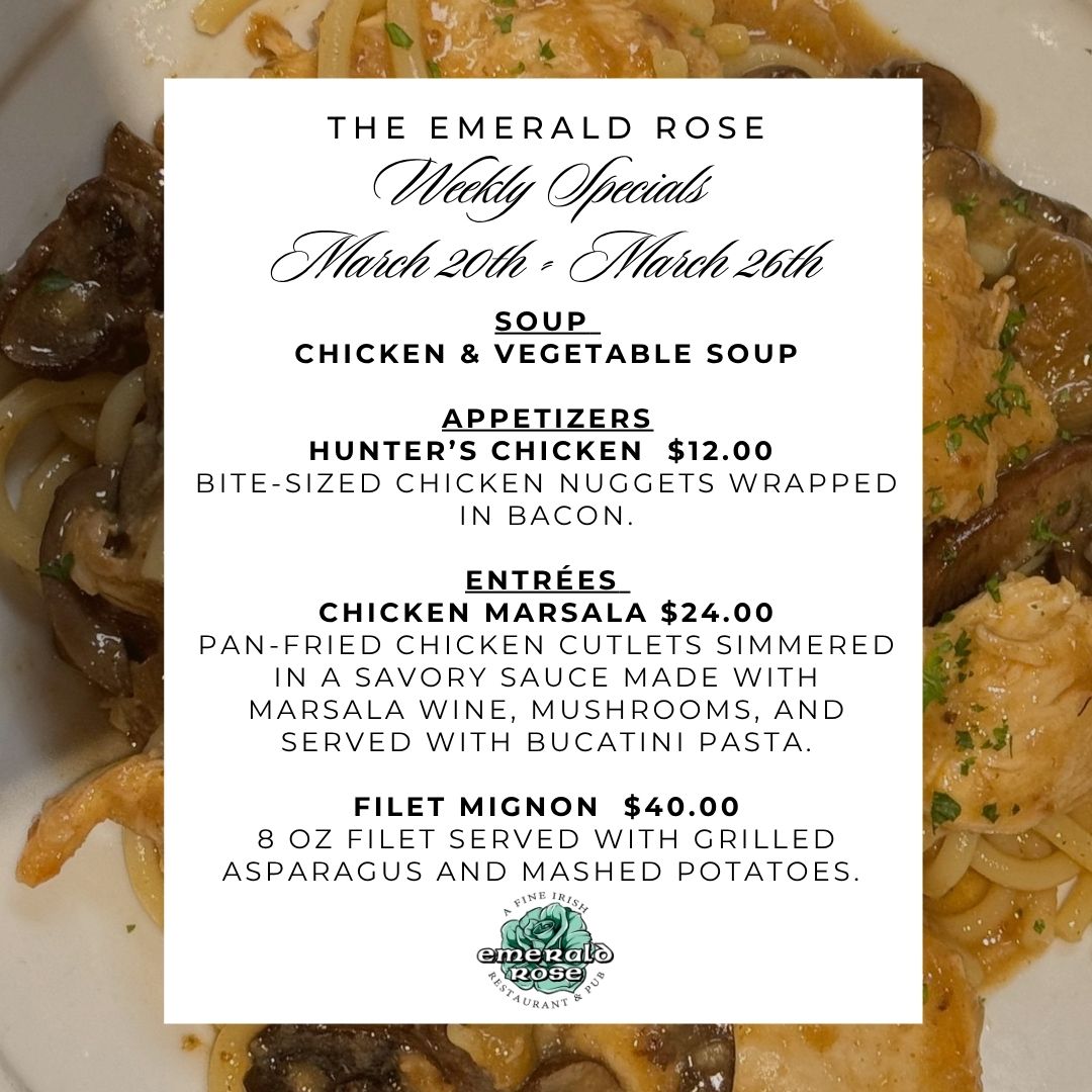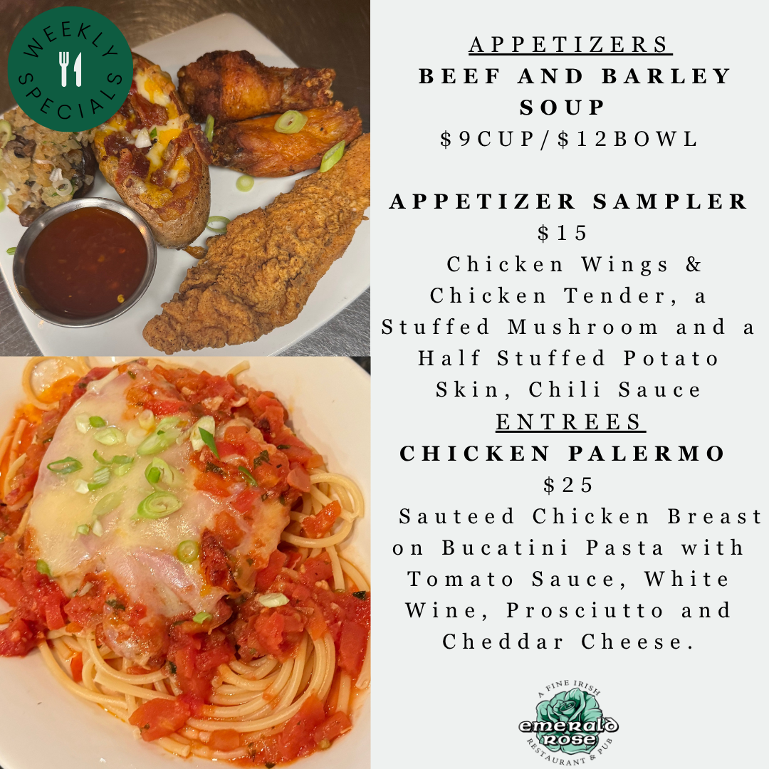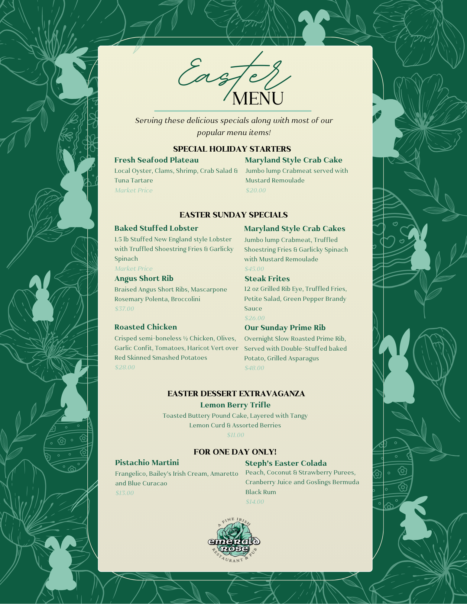 Enjoy The Emerald Rose experience from the comfort of your own home. Choose from our full menu of traditional Irish classics and hearty pub bites, ready for convenient pick-up or delivery.